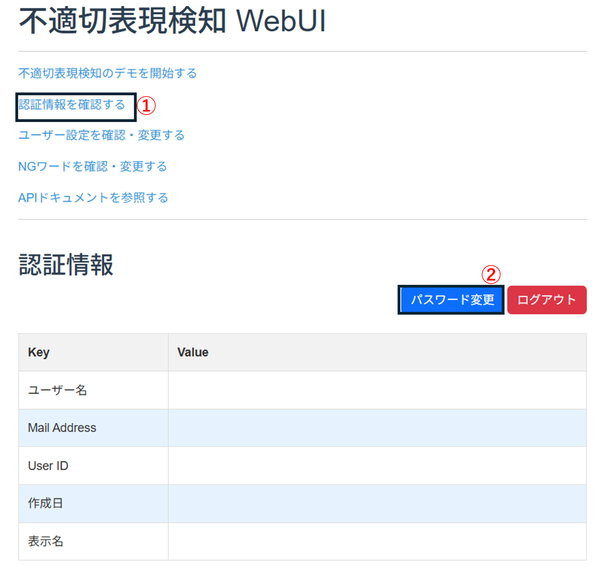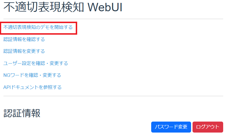 - 「不適切表現検知のデモを開始する」をクリックし、WebUIのデモ画面を開きます。