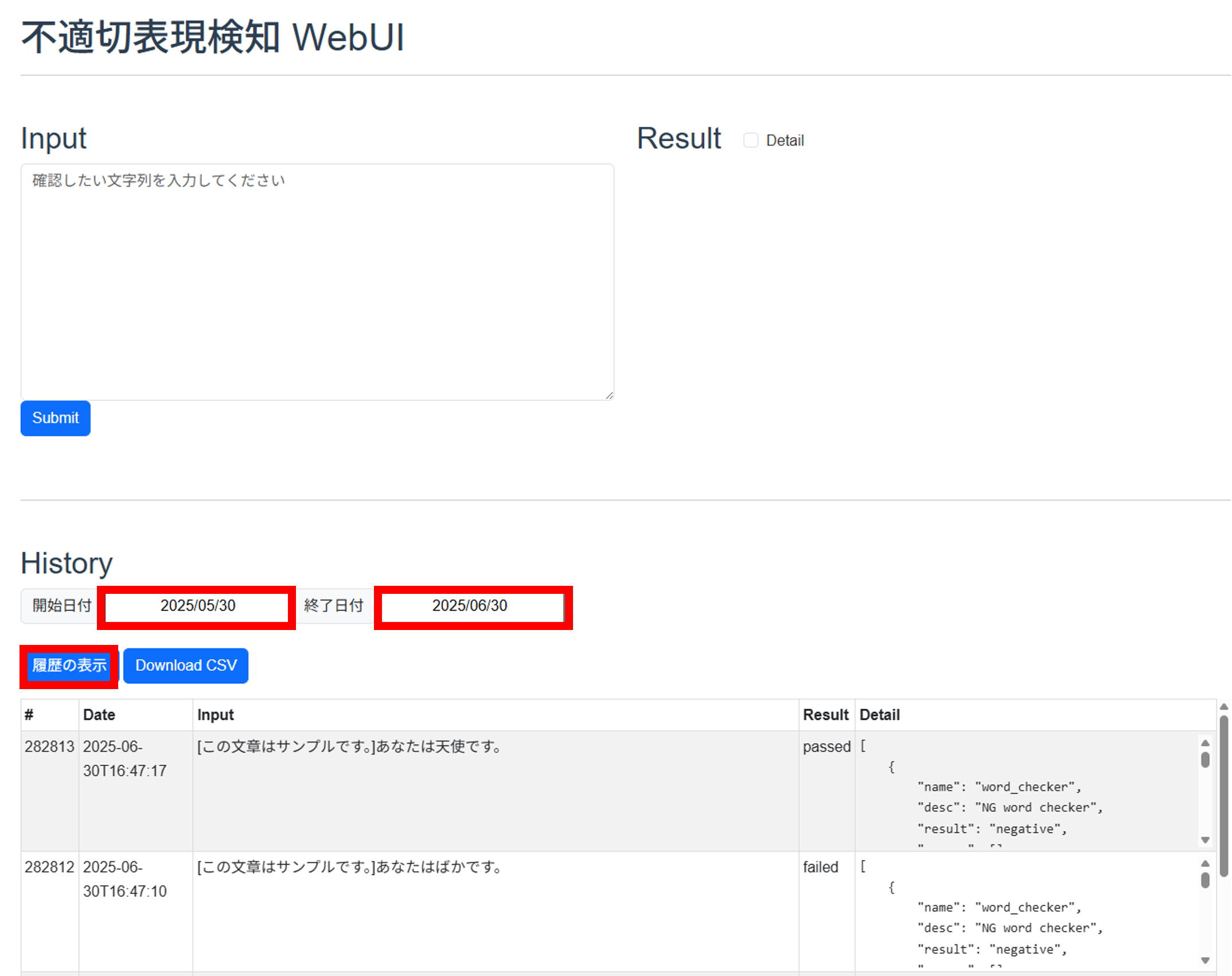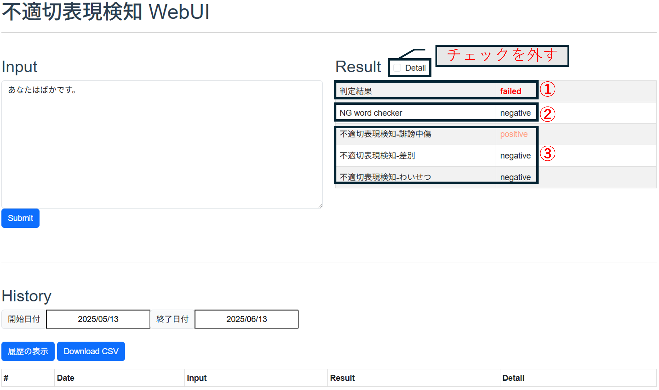 History機能では、ユーザーが過去に判定した⽂章の判定履歴の表⽰や、CSV形式でダウンロードができます。判定履歴には、不適切表現の検知結果に関わらず、すべての判定結果が記録されています。