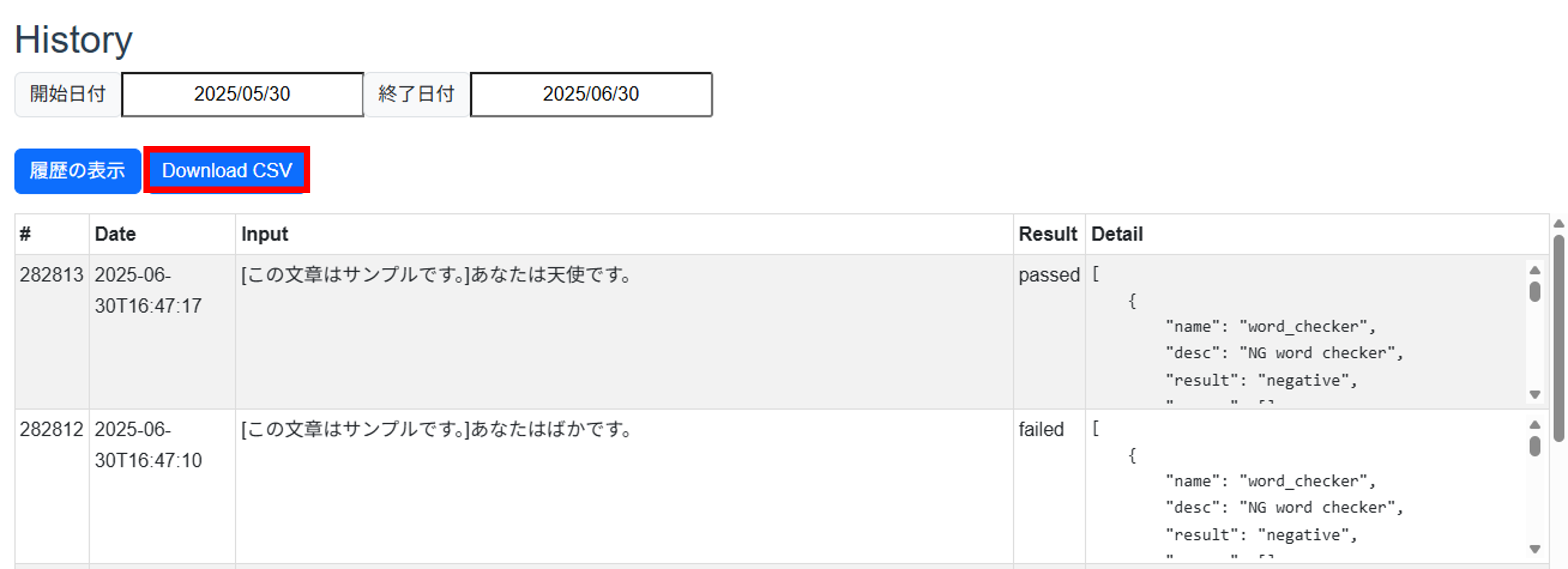 - 「Download CSV」ボタンをクリックし、判定履歴をダウンロードします。
