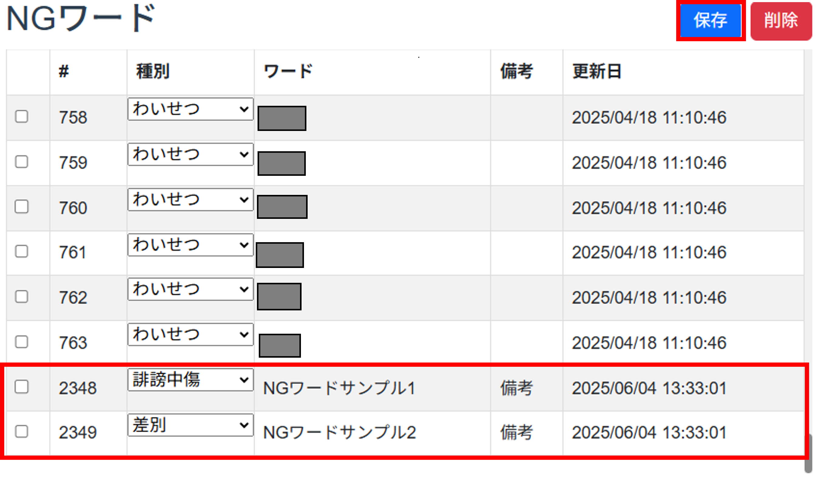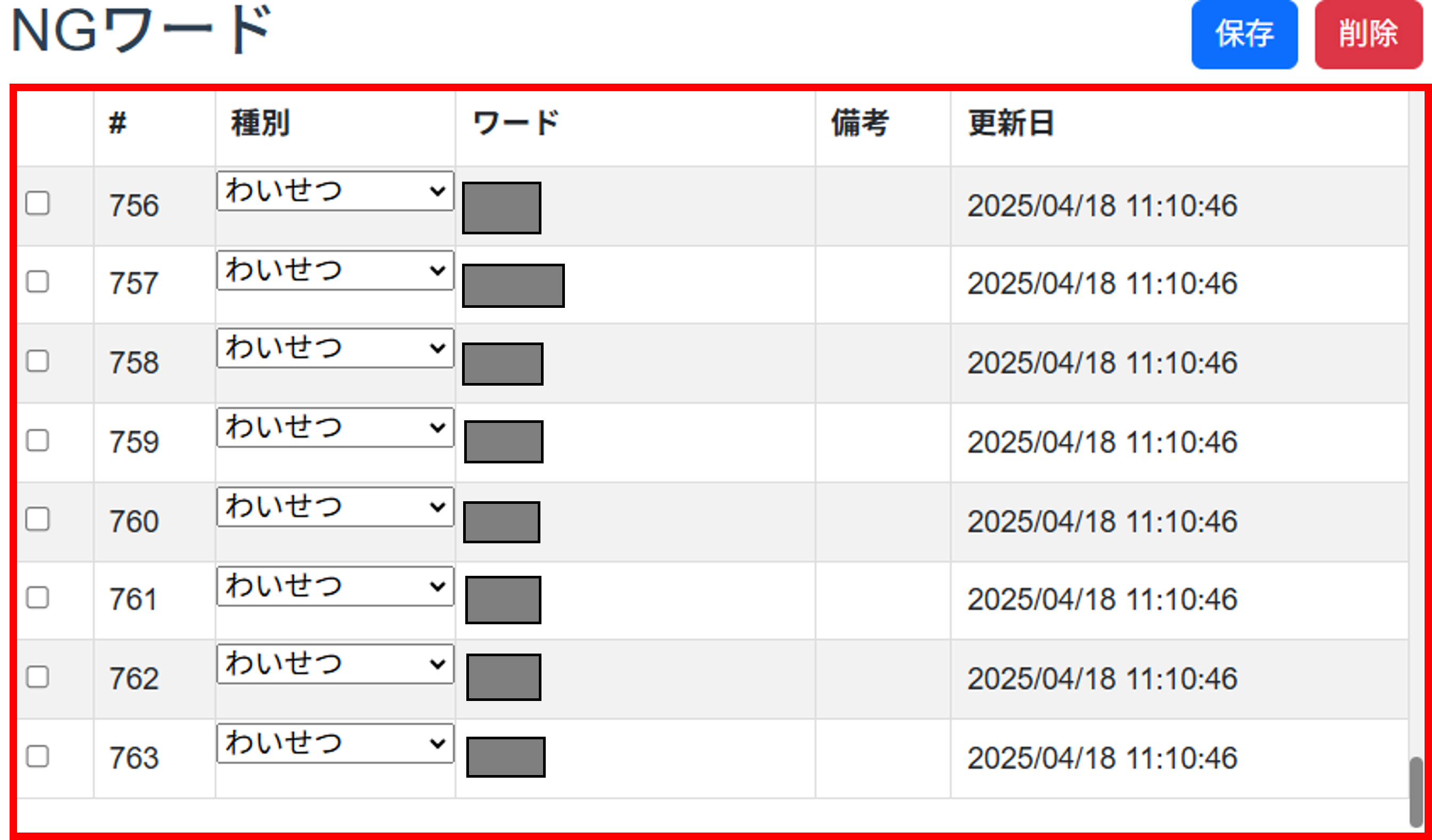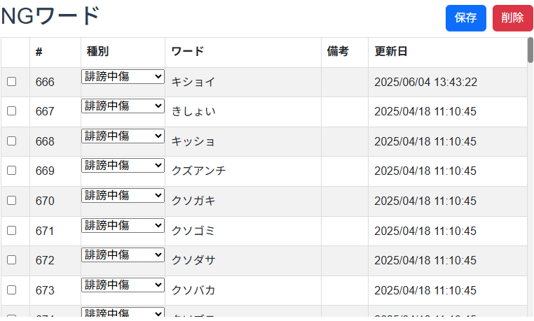 - 更新日: NGワードの最終更新日付を示す項目です。