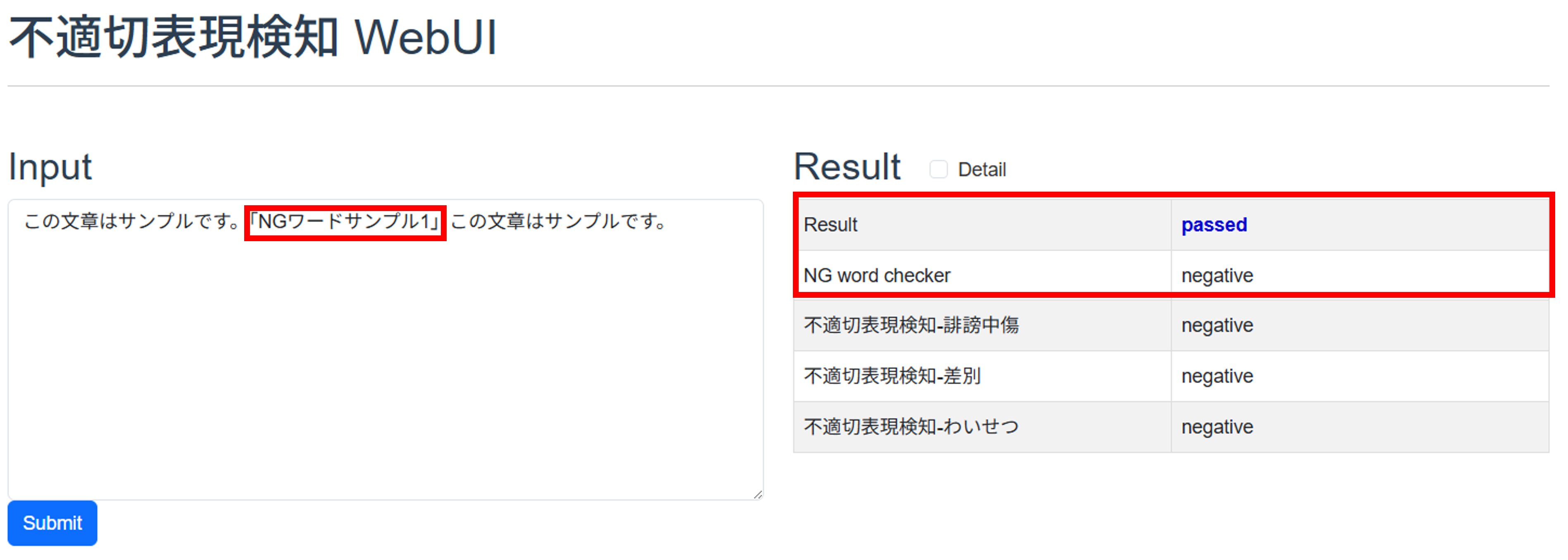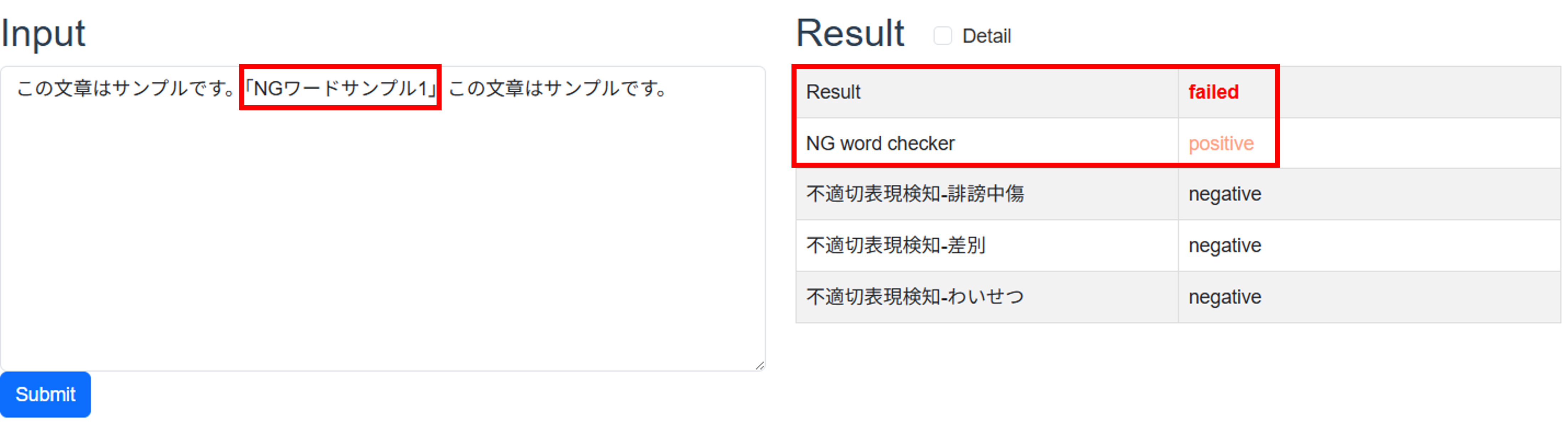 passed、含まれる場合はfailedと表示されます。 - NG word checker: 入力された文章に、あらかじめ登録されているNGワードが含まれているかを示します。含まない場合は