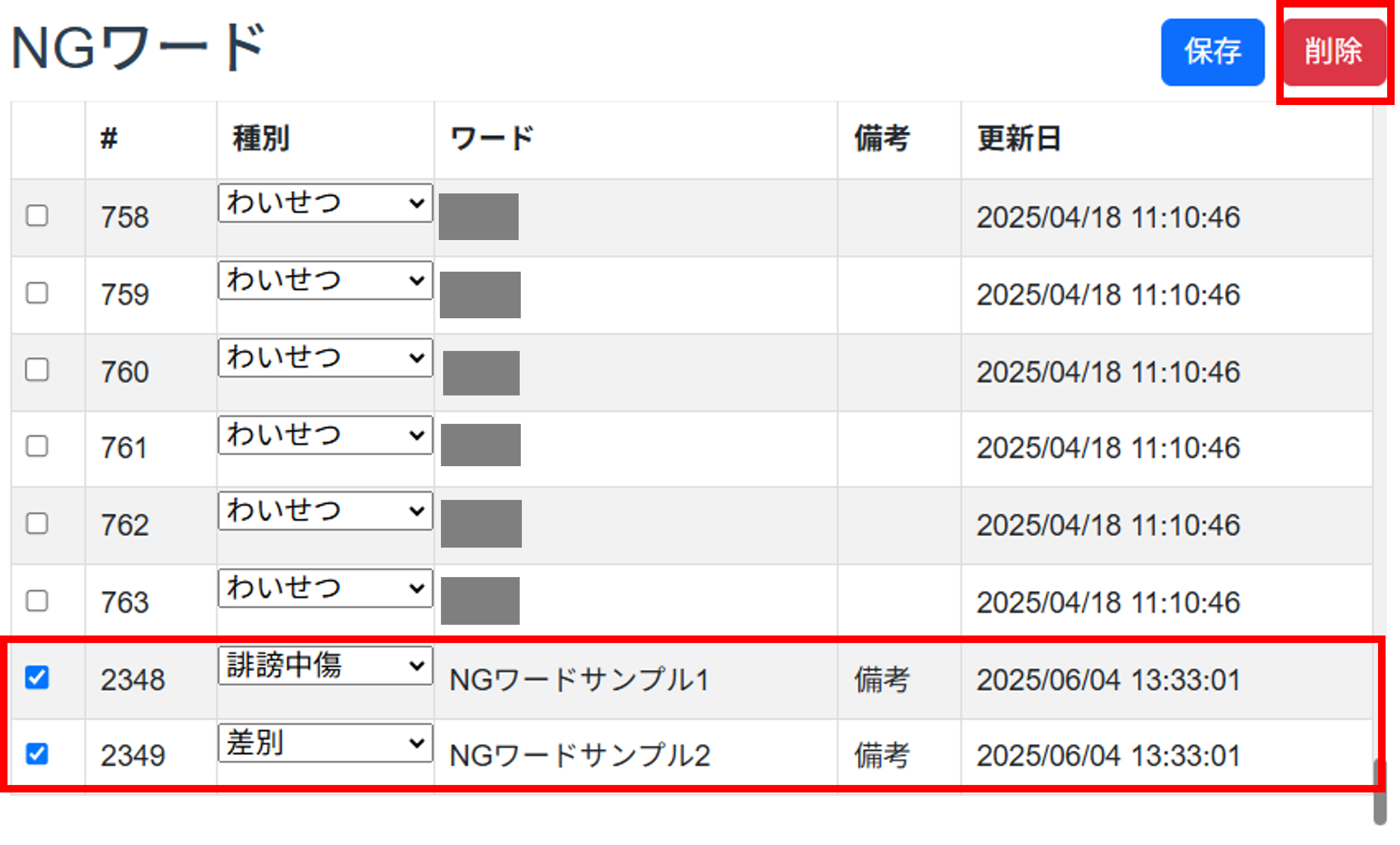 - 削除したいNGワードのチェックボックスをクリックし、チェックします。