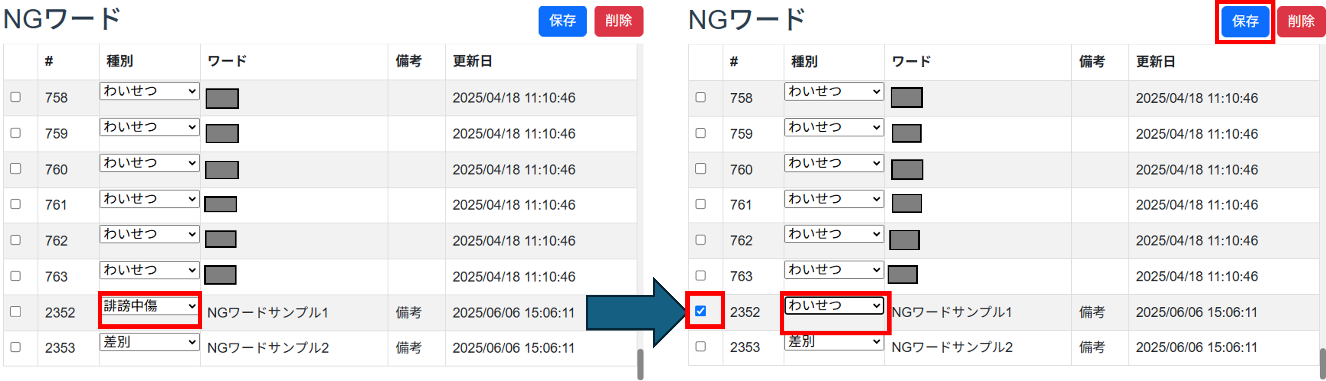 - 変更したいNGワードのチェックボックスをクリックし、チェックします。