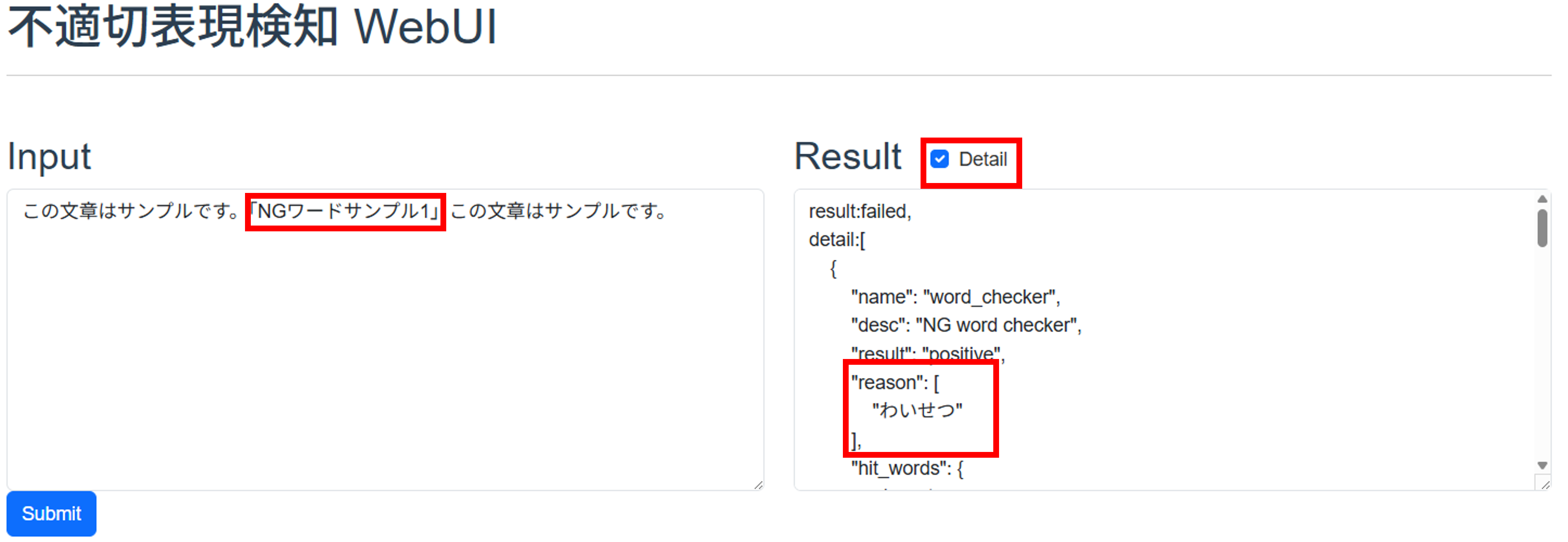 REST APIによる検知を利用する際に返却される詳細な判定結果を表示する表示モードです。