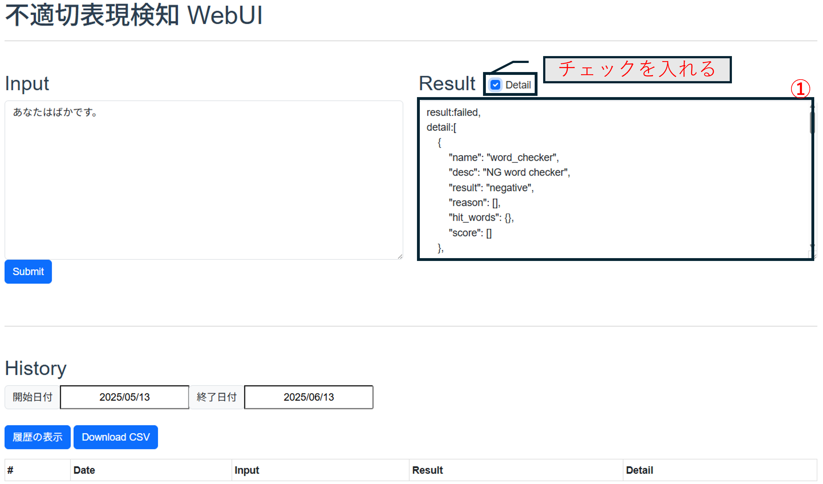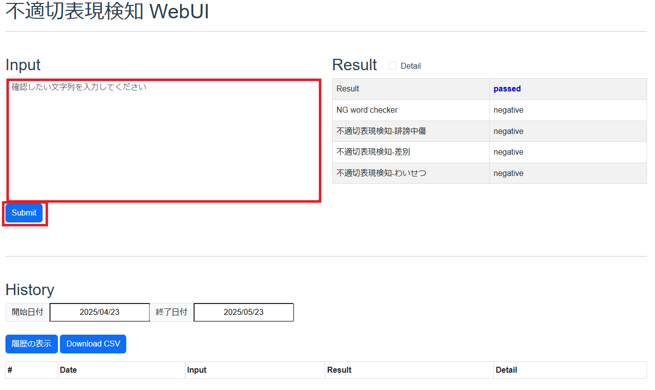 - 判定結果: 入力された文章に不適切表現が含まれているかを示します。不適切表現が含まれない場合は